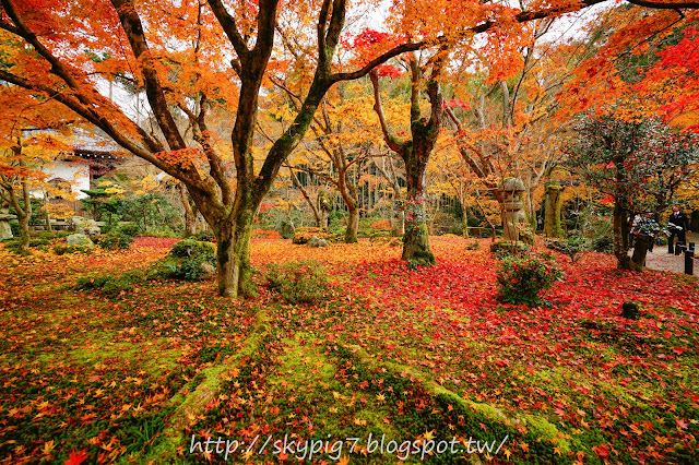 圓光寺的楓紅非常漂亮,算是這次賞楓行程意外的驚喜,可惜我的前三名已經給了別人,只能給圓光寺第四名了。圓光寺裏最讓人驚艷的地方莫過於「十牛之庭」,庭院裏紅黃交錯,色彩幻化,最佳的觀賞時段是在紅葉剛掉落不久,樹頭可能會有一點稀疏,但是卻能看見最美的紅葉地毯,很慶喜這次能看到圓光寺的夢幻美景。